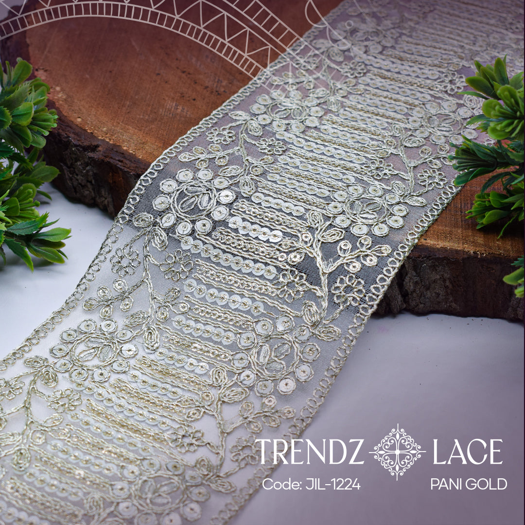 Enhance your creations with Trendz Lace – JIL-1224, an exquisite embroidered lace featuring delicate floral motifs with intricate threadwork and sequins. This luxurious lace, set on a soft sheer base, shines with its subtle yet stunning Pani Gold accents, offering an elegant texture and gentle sheen.