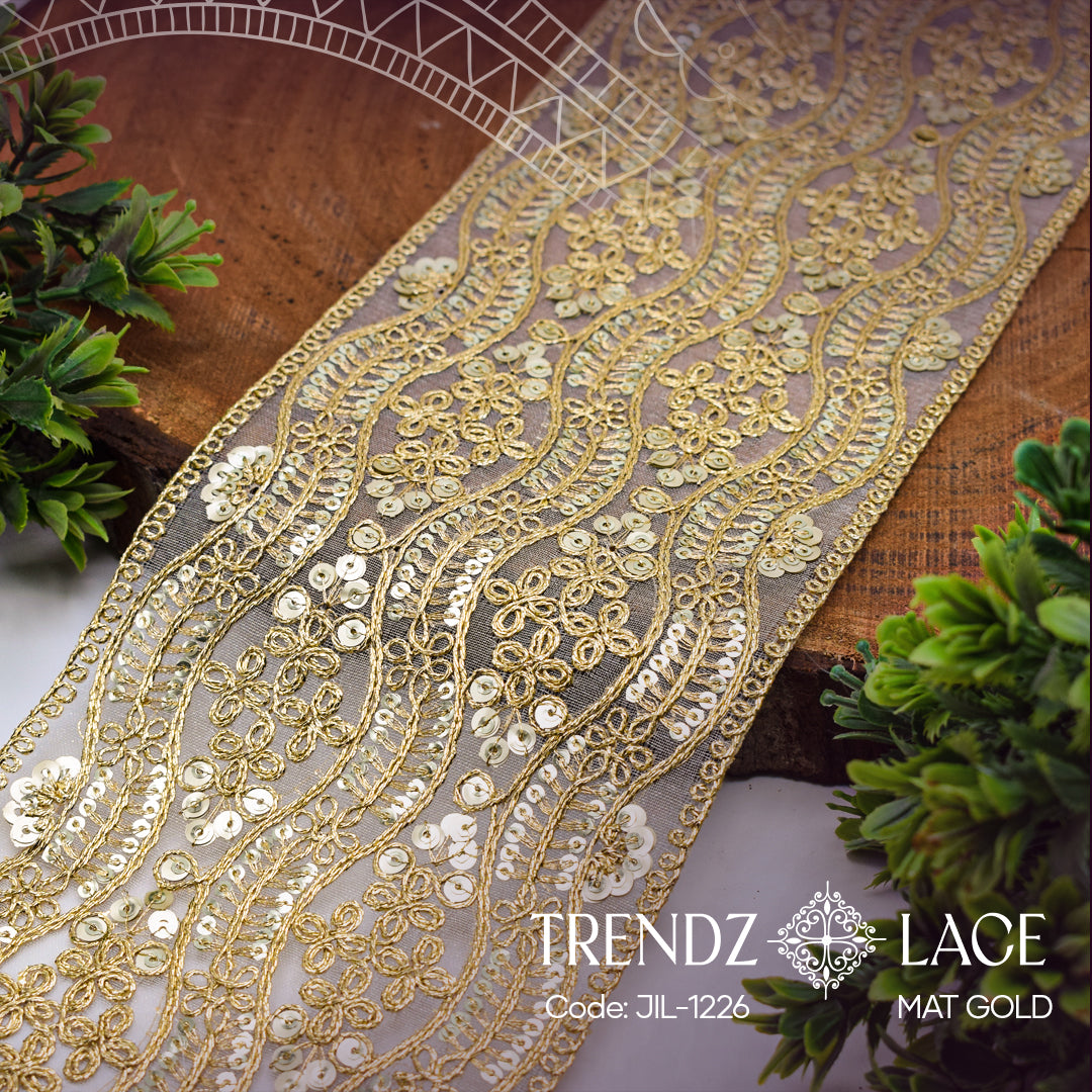 Elevate your creations with Trendz Lace – JIL-1226, a stunning embroidered lace featuring graceful floral motifs intertwined with delicate threadwork and shimmering sequins. This luxurious lace, set on a soft sheer base, boasts a sophisticated mat gold finish, offering an elegant texture and subtle sheen.