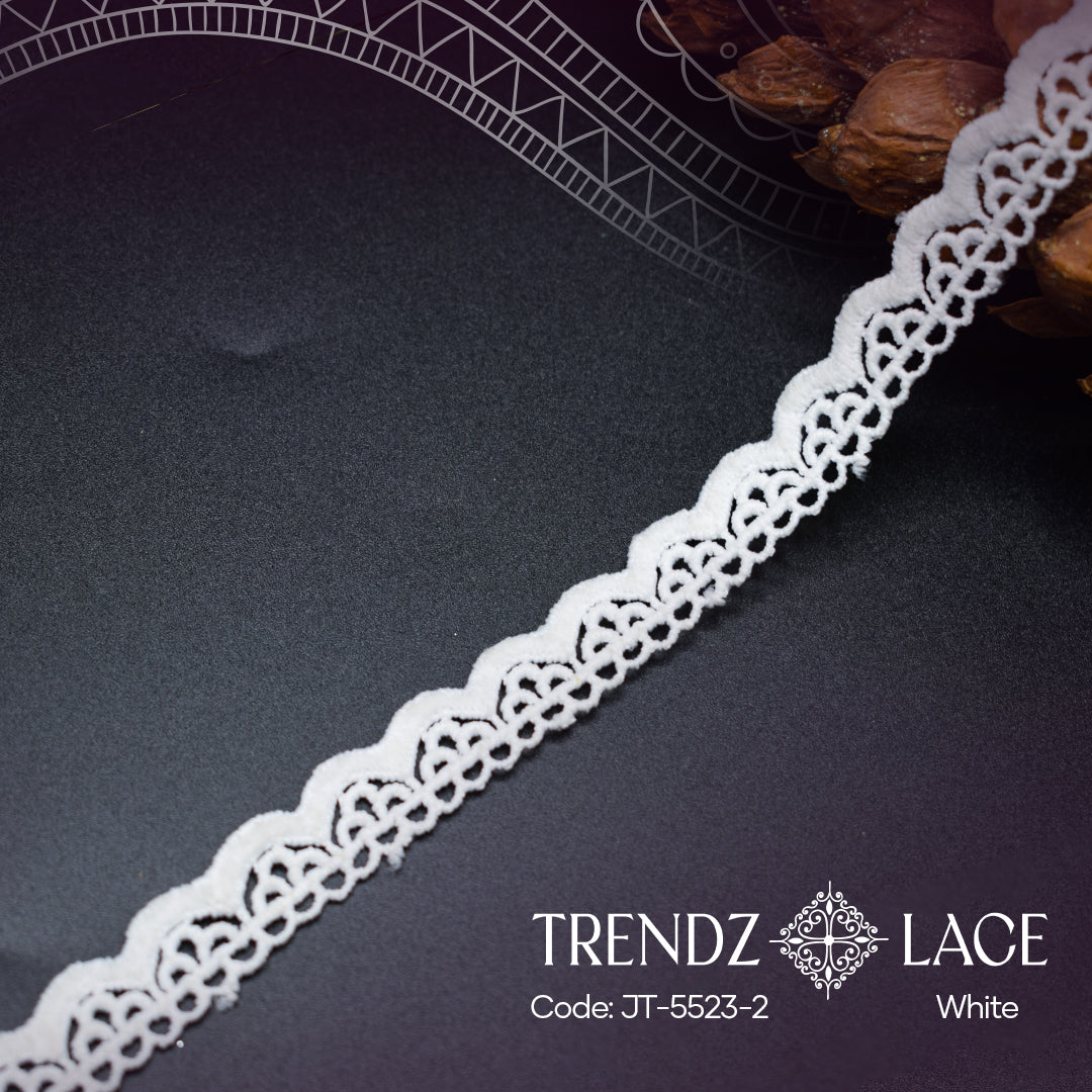 Step into refined simplicity with Trendz Lace – JT-5523-2, a beautifully crafted narrow lace trim that adds a subtle yet elegant finish to your designs. Featuring a soft scalloped edge with fine geometric threadwork, this lace is ideal for delicate detailing where sophistication is key.