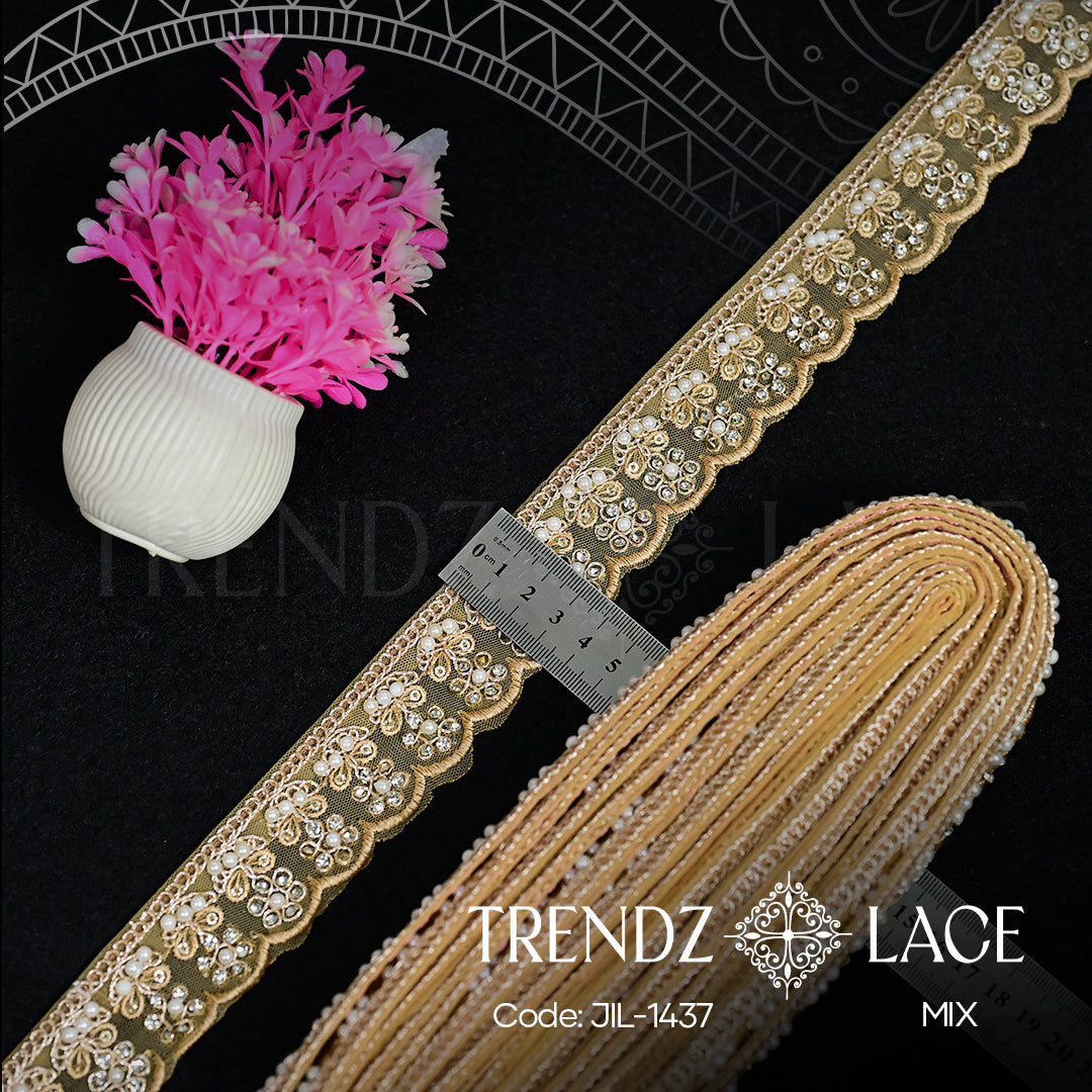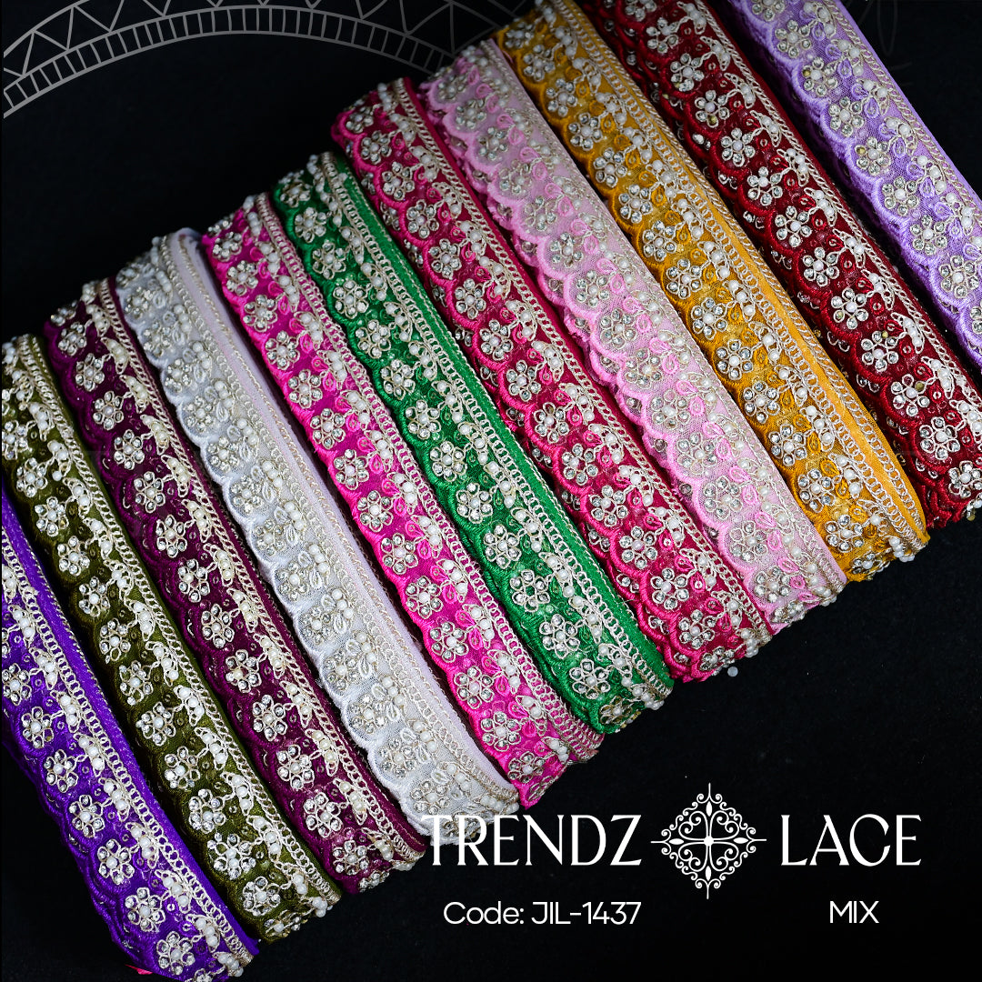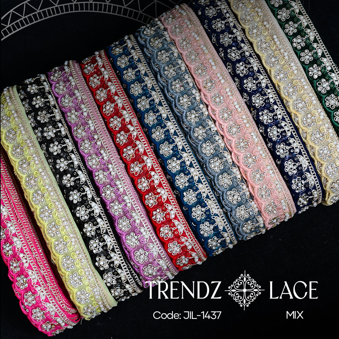 Infuse your garments with vibrant color and intricate sparkle using Trendz Lace – JIL-1437. This beautiful fancy lace trim features a delicate, repeating floral pattern intricately embroidered and richly embellished with shimmering imitation pearls and clear rhinestones. The design is set on a base of assorted, rich colors, framed by a soft, scalloped edge, making it an ideal choice for adding a joyful and ornate finish.