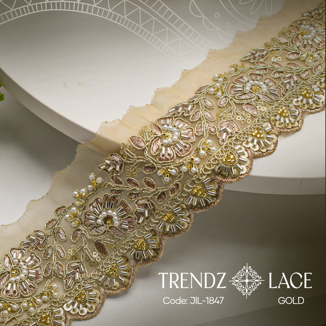 Indulge in the opulent beauty of Trendz Lace – JIL-1847, an exquisite gold fancy lace trim designed to elevate any garment or décor. This lace features a stunning floral motif, richly embroidered with lustrous gold threads, delicate white pearls, and sparkling gold and silver beads. The intricate craftsmanship creates a textured, dimensional design that catches the light beautifully, offering a truly luxurious appeal. Set on a sheer net base with a scalloped edge, this lace adds both grandeur and grace.
