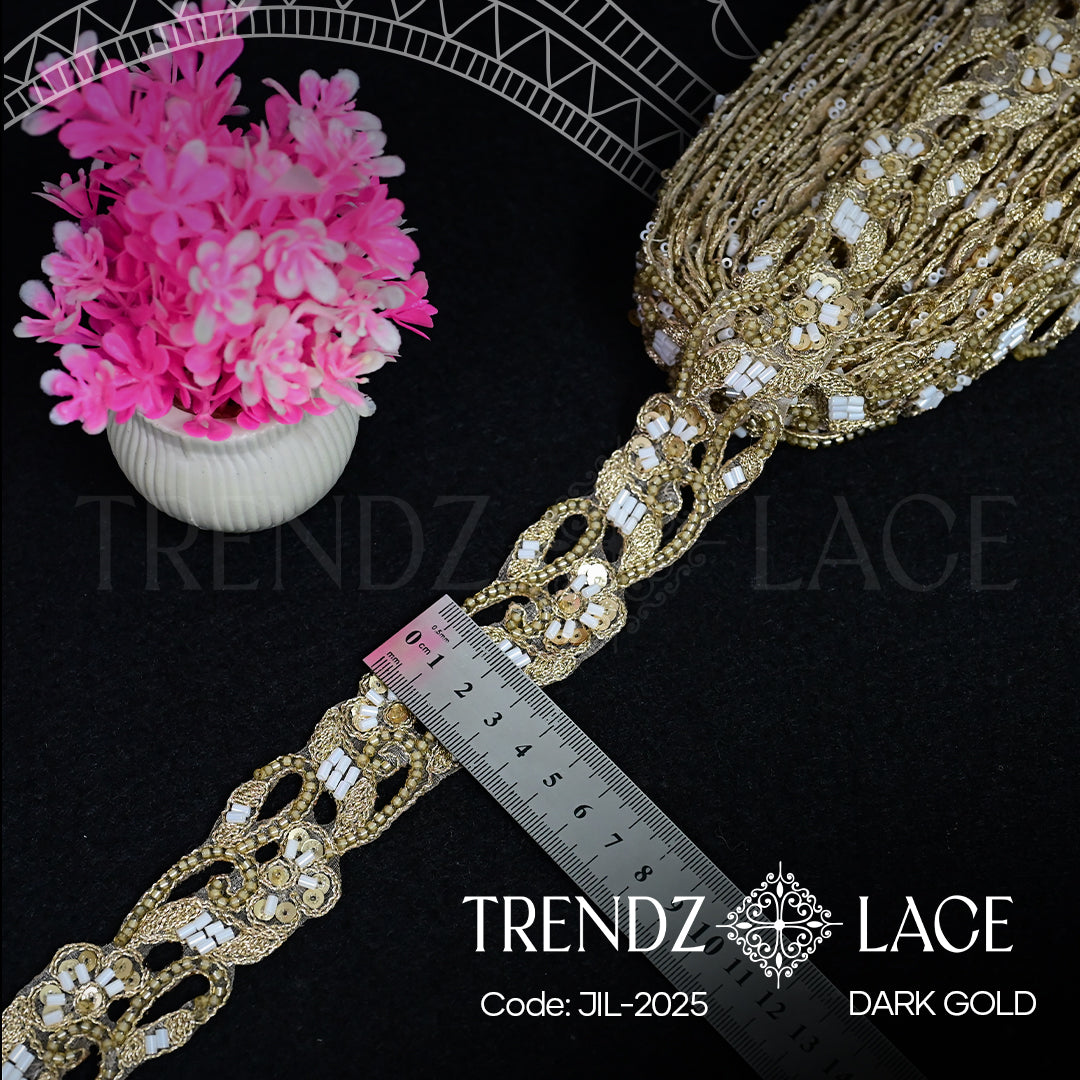 Elevate your designs with the magnificent and intricate detail of Trendz Lace – JIL-2025. This exquisite fancy lace trim features an elaborate floral and vine-like pattern, richly embellished with shimmering sequins, fine white beads, and metallic accents. The continuous design creates a sophisticated, multi-dimensional texture that radiates luxury and is available in a versatile range of metallic shades. The detailed craftsmanship offers a magnificent and high-end finish, perfect for adding a sophisticated border.