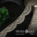Add a touch of timeless sophistication to your designs with Trendz Lace – HM-JIL-1211. This exquisite fancy lace trim features a gracefully undulating, scalloped pattern, meticulously adorned with lustrous imitation pearls and sparkling clear rhinestones. The half-moon motifs are intricately filled with both pearls and rhinestones, all outlined with fine metallic threadwork. The combination of these classic embellishments creates a rich, textured, and highly reflective border that radiates elegance and luxury.