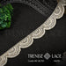 Add a touch of timeless sophistication to your designs with Trendz Lace – HM-JIL-1721. This exquisite fancy lace trim features a gracefully curving, scalloped pattern, meticulously adorned with lustrous imitation pearls and shimmering clear rhinestones. The half-moon motifs are intricately filled with both pearls and rhinestones, all outlined with fine metallic threadwork. The combination of these classic embellishments creates a rich, textured, and highly reflective border that radiates elegance and luxury.